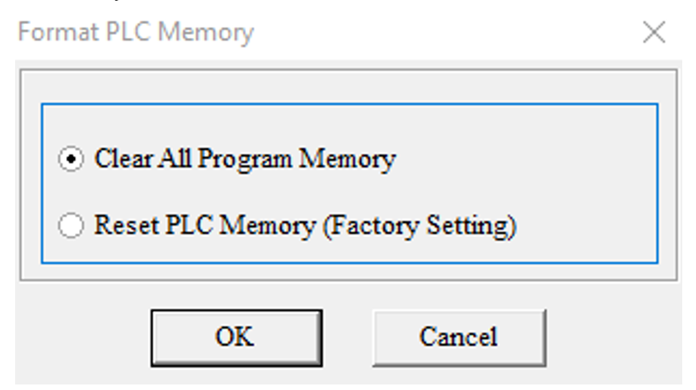Program znajdujący się na sterowniku PLC serii AS200 można usunąć z poziomu ISPSoftu. Aby to zrobić należy mieć aktywne połączenie ze sterownikiem. Następnie w oprogramowaniu ISPSoft, należy wejść w zakładkę [PLC] -> [Format PLC Memory…]. W otworzonym oknie należy wybrać opcję Clear All Program Memory.